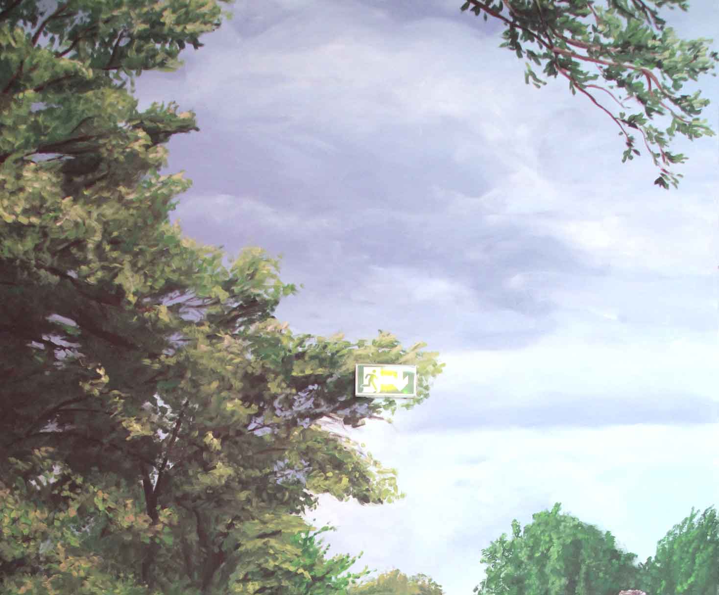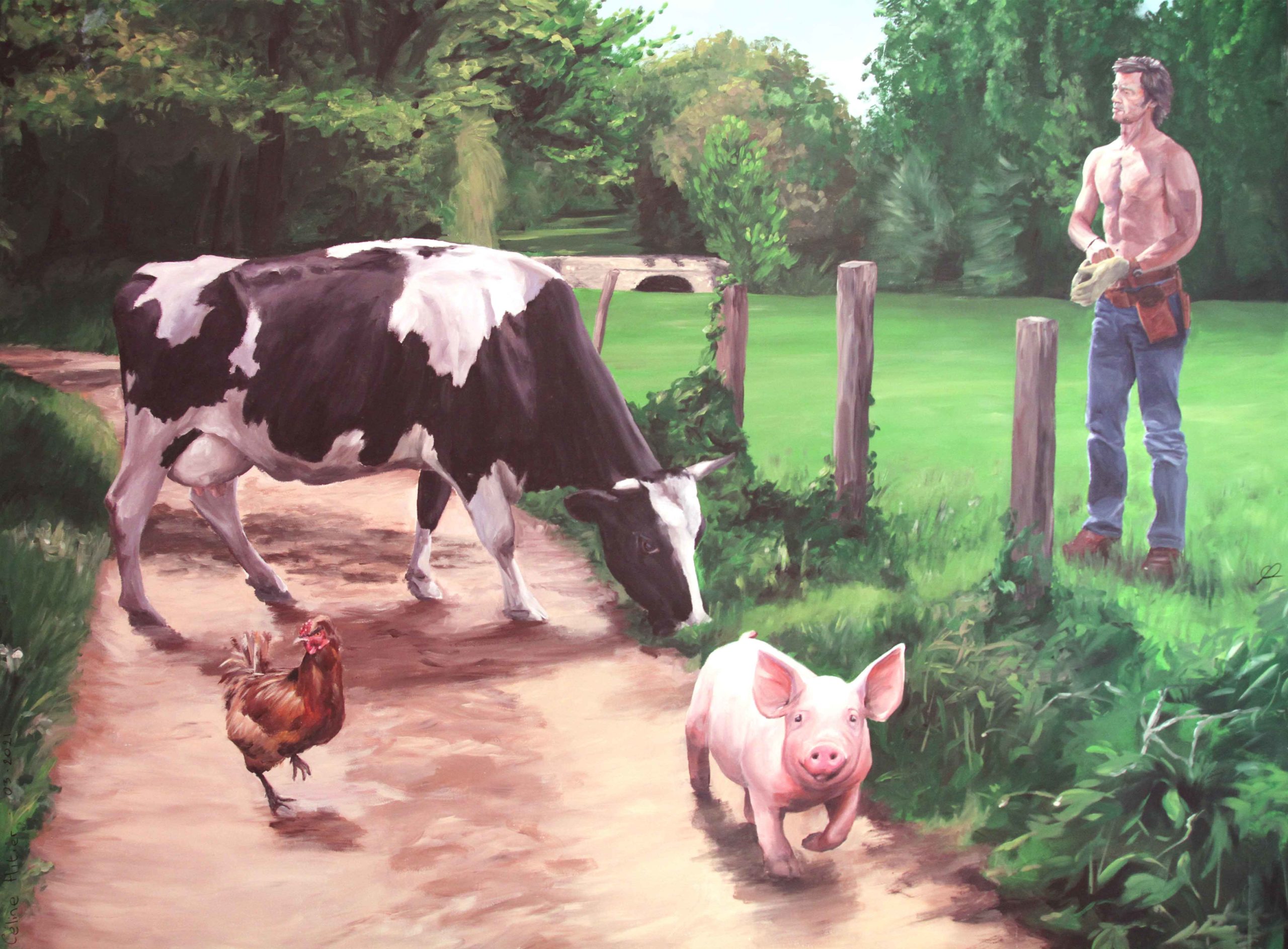 On trouve donc 2 faces à ce projet, d’un coté, un Brad au milieu des animaux de la ferme : « où est Angelina » . Un mur de 6m de haut sur 3m de large, le décor trace un chemin qui suit la montée dans les escaliers et emmène vers une promenade bucolique où on retrouve le héro un peu désœuvré. Le petit cochon qui coure vers le visiteur fait écho aux murs roses environnants. Le haut de cette peinture ouvre le plafond de l’escalier vers le ciel.